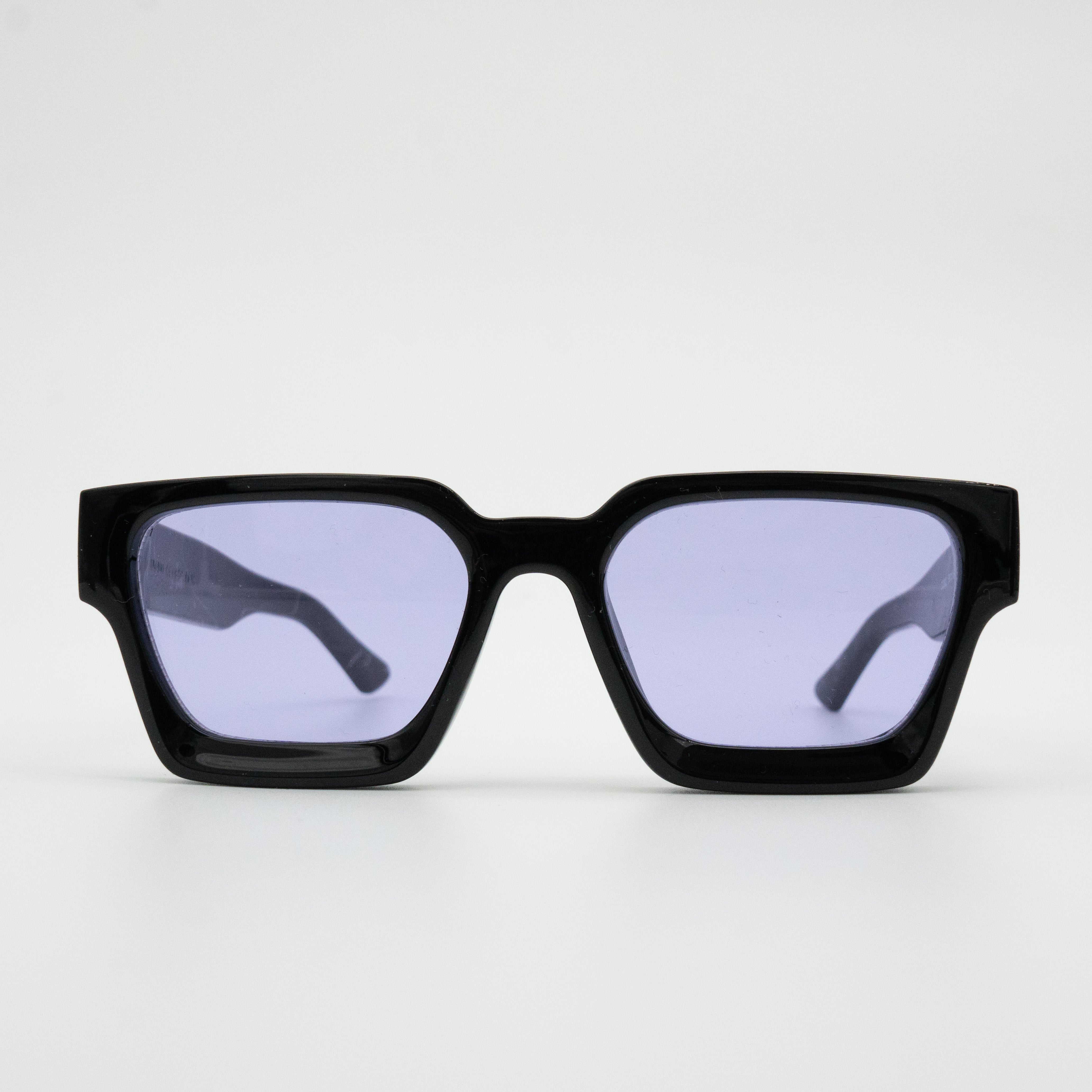 Thick black frame with deep blue lenses
