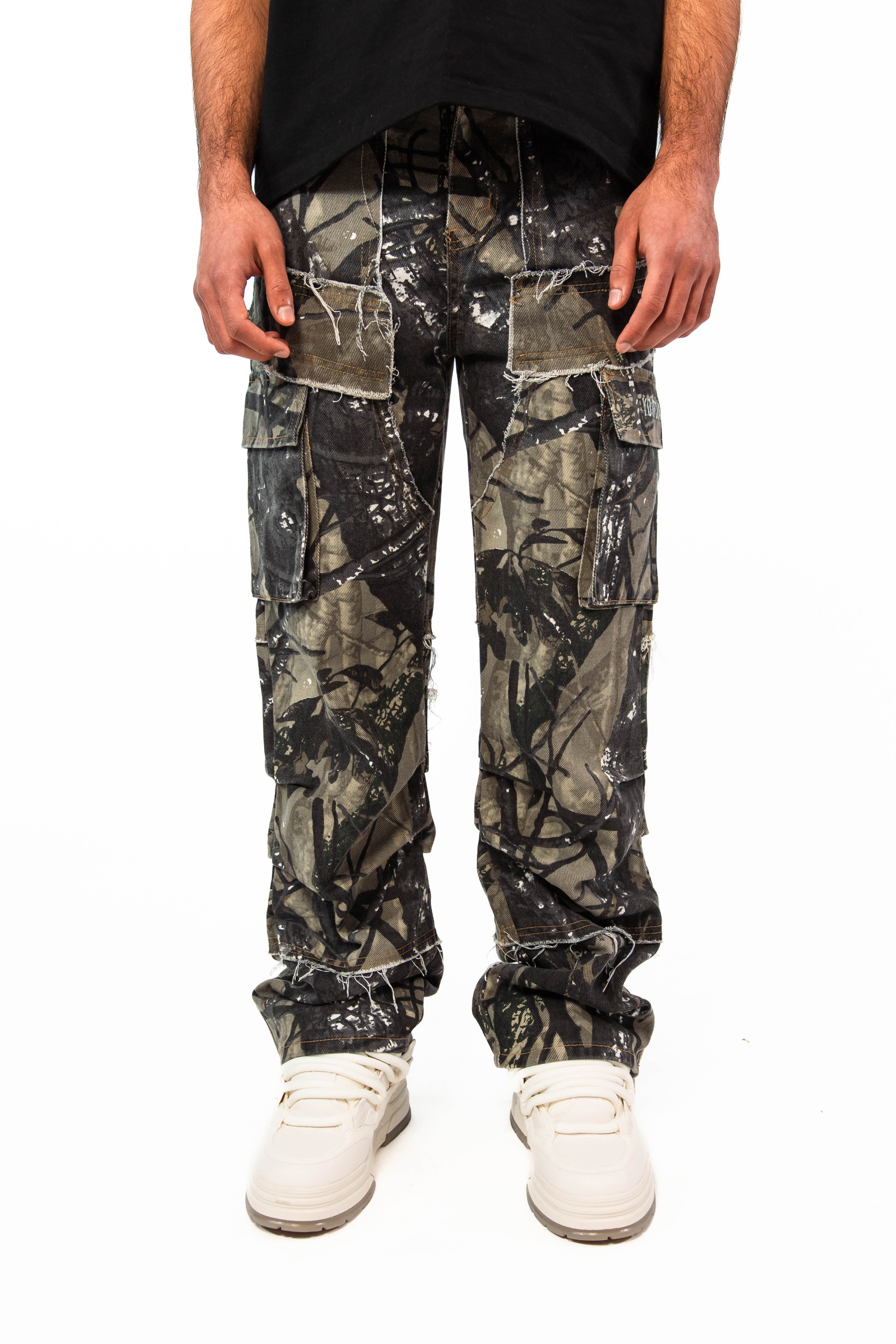 Camouflage print, functional pockets and subtle distressing throughout.